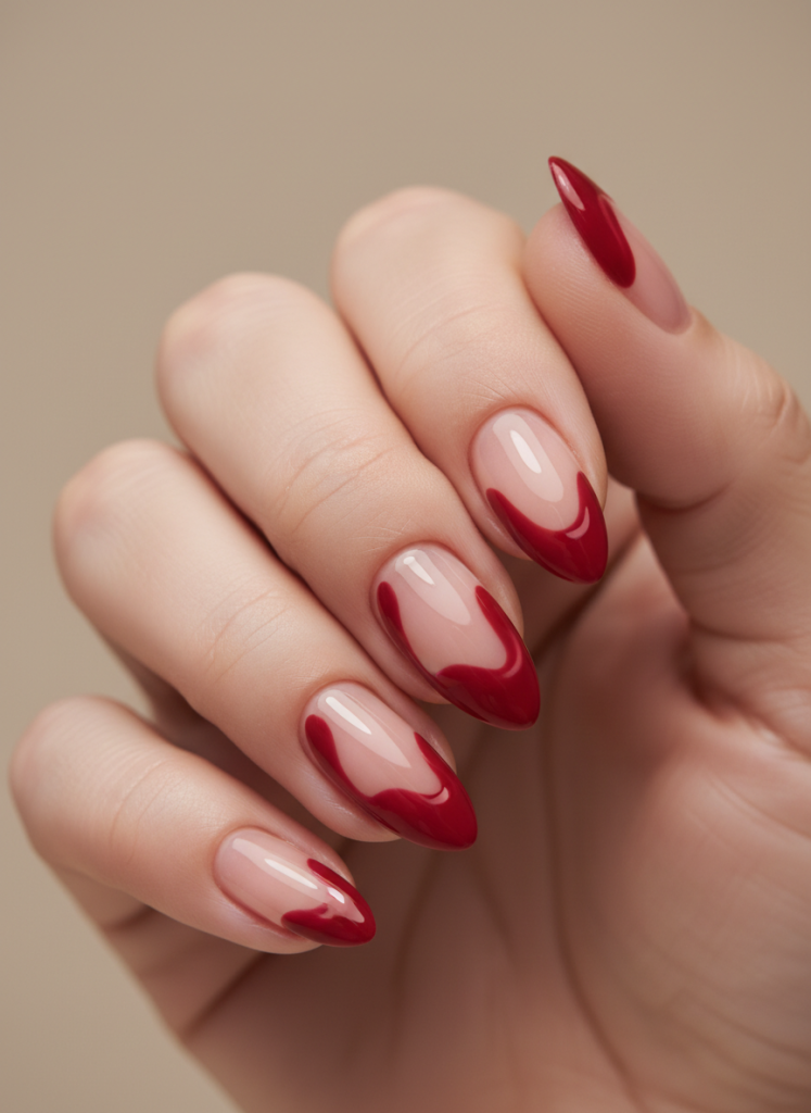 This design softens the traditional straight French line into a gentle curve that follows the natural shape of the nail. The rounded red tip feels modern and feminine — a subtle twist that makes a big difference.
