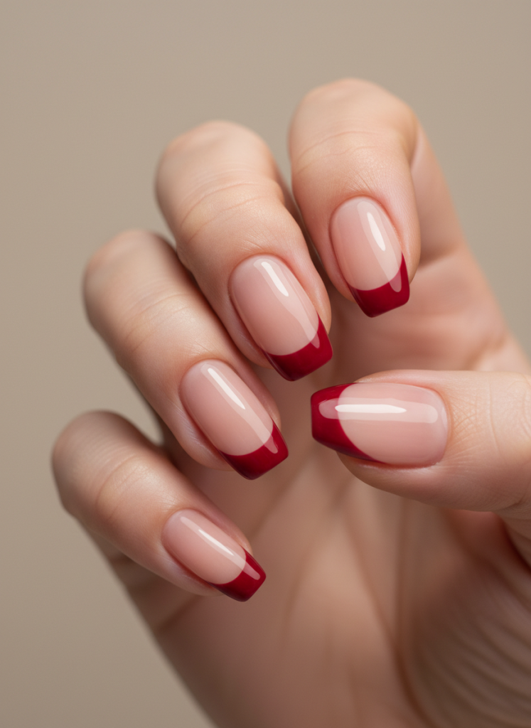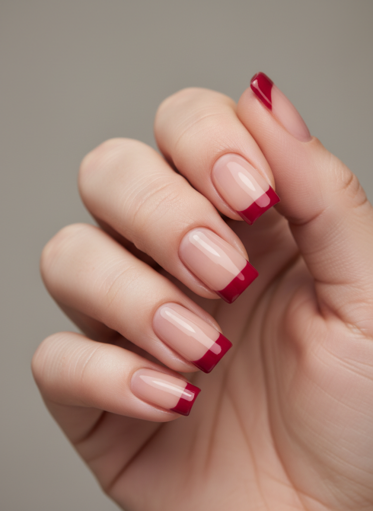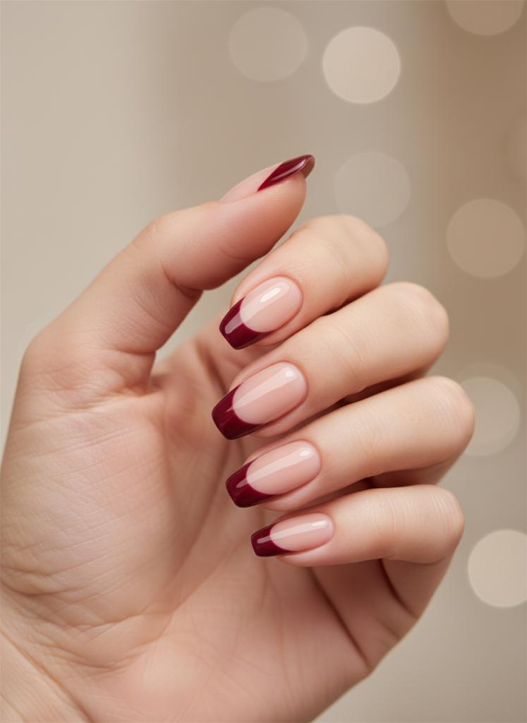 Rich wine-red tips sit on a warm nude base for a moody, sophisticated vibe. The deeper shade gives this French manicure a sultry edge that’s perfect for cooler months.