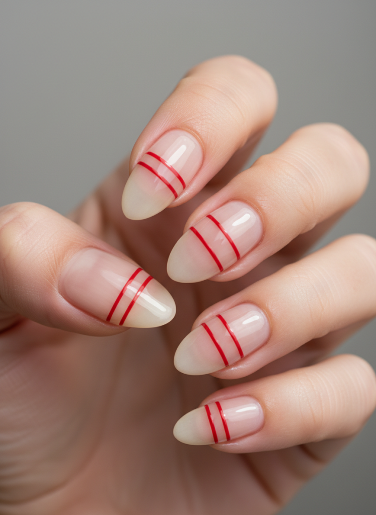 Two parallel thin red lines sit at the tip of each nail, creating a subtle striped effect that looks incredibly polished. It’s minimalist but detailed — the kind of design that gets closer-look compliments.