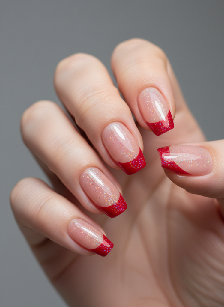 Red tips sprinkled with fine gold glitter create a luxurious, regal effect. The gold adds warmth and dimension that makes the red feel even richer — like something out of a holiday lookbook.