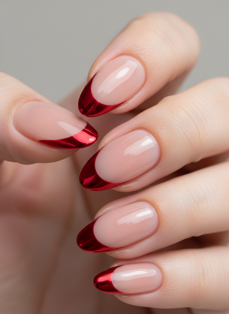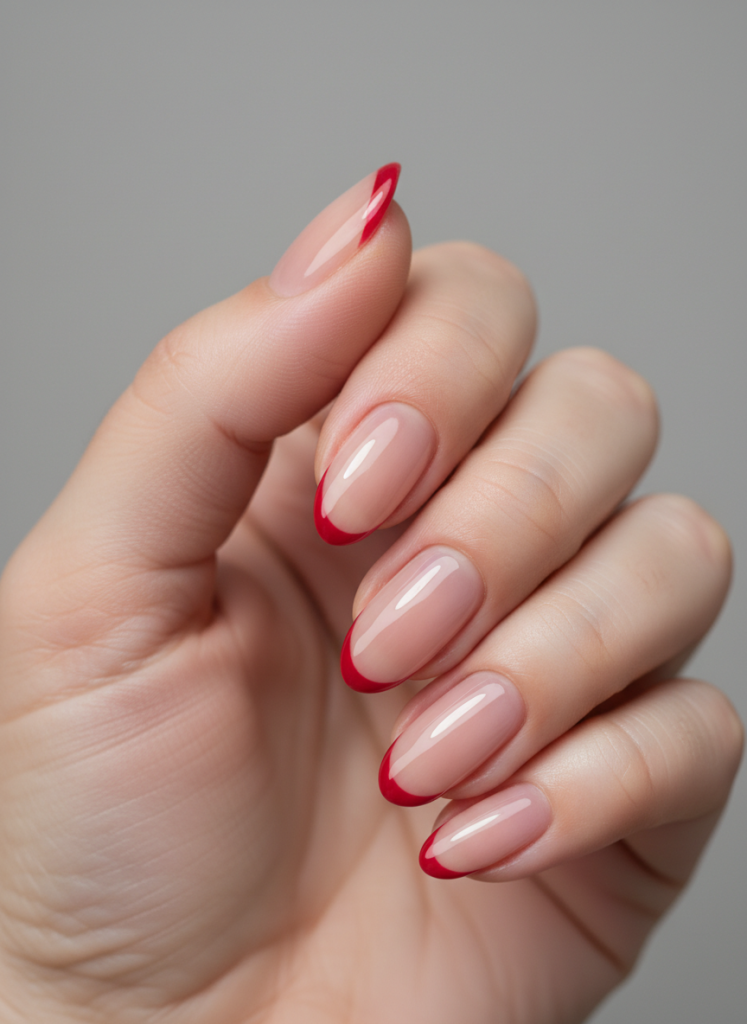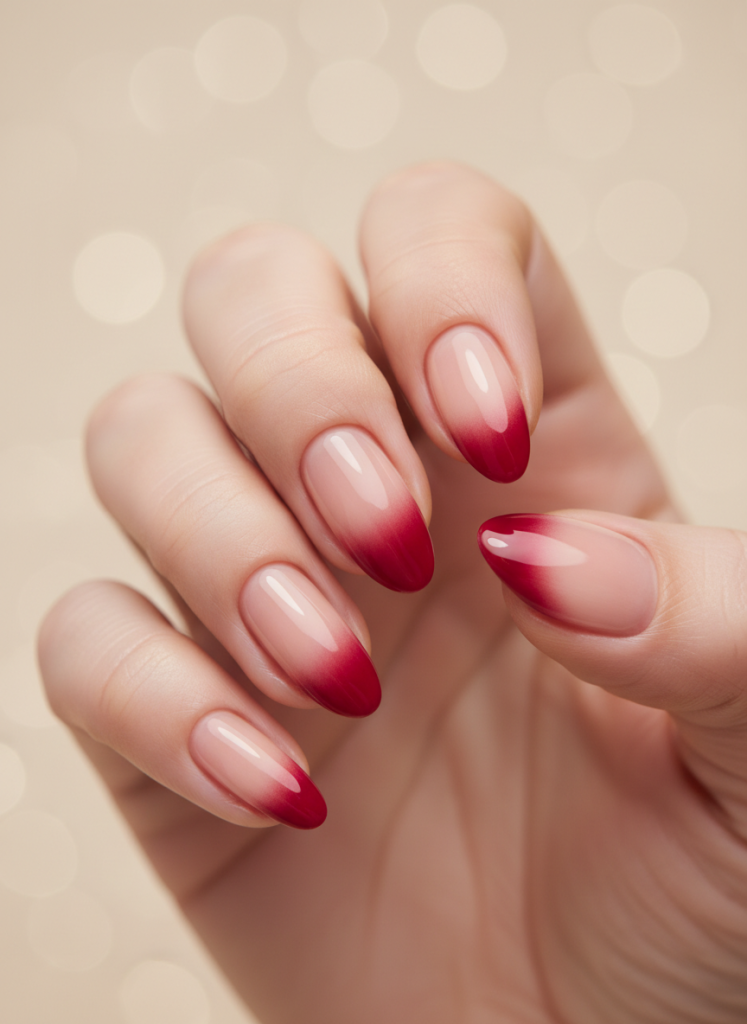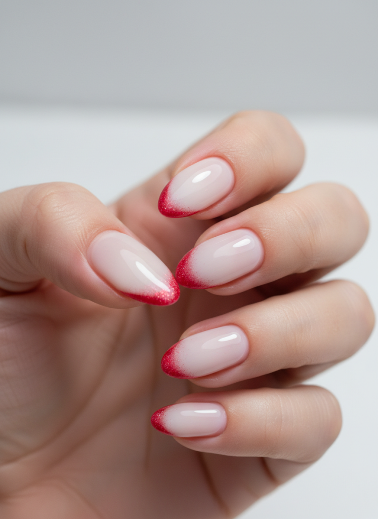Instead of a sharp line, the red tip melts into the nude base with a beautiful ombré gradient. The seamless fade feels softer and more romantic than a traditional French tip — and it’s one of the most-pinned red nail looks right now.