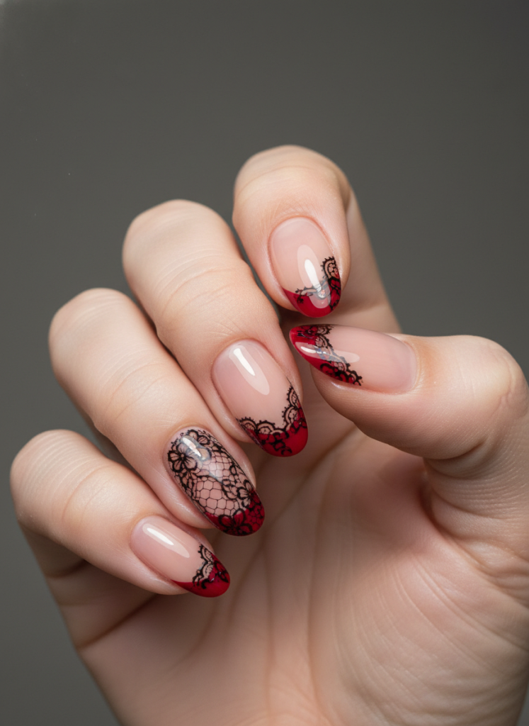 Delicate black lace-inspired nail art lines the edge of each red tip, adding a romantic gothic touch. The lace pattern is intricate but subtle — like a vintage detail that gives this mani a seductive, mysterious edge.