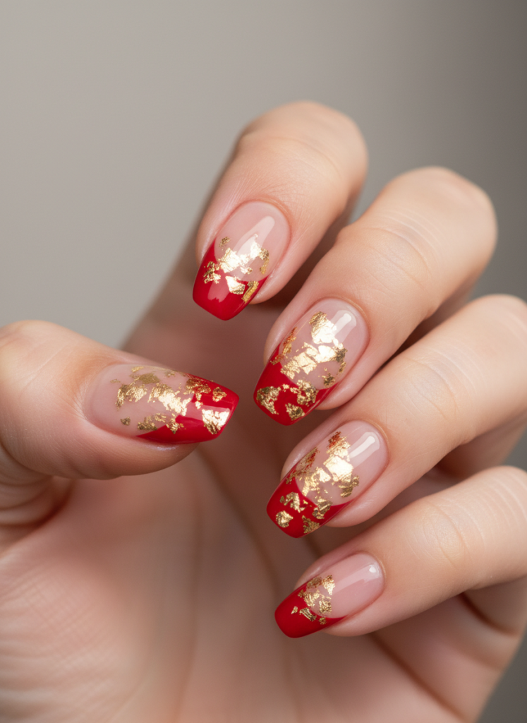 Delicate gold foil flakes are scattered along the smile line where the red tip meets the nude base. The gold catches the light and adds a luxurious touch that makes this design feel expensive and elevated.