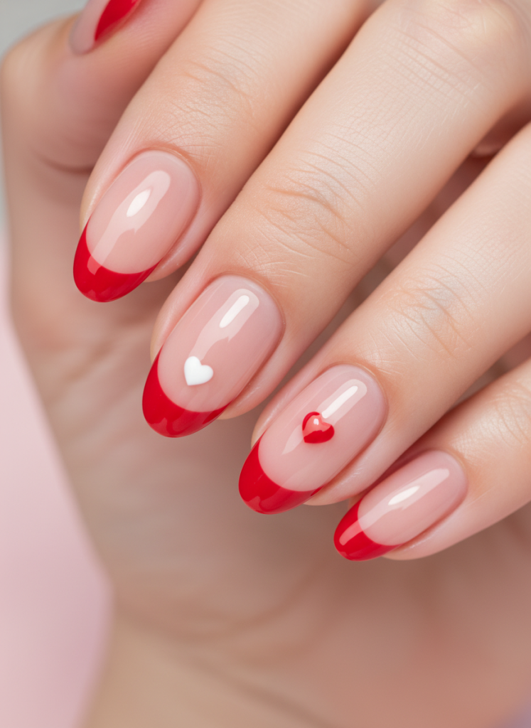 The classic red French tip gets a romantic upgrade with a tiny red heart painted on the accent nail — usually the ring finger. It’s sweet, eye-catching, and perfect for anyone who loves a little extra detail.