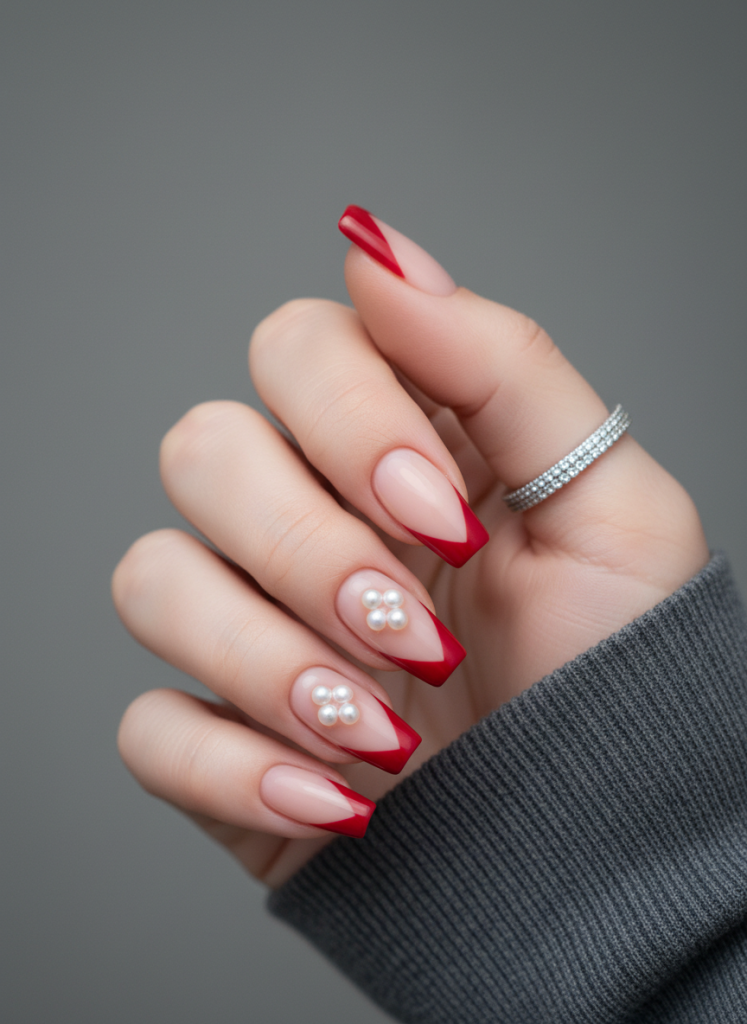 A cluster of tiny pearl embellishments sits at the base of the ring finger nail while all nails feature polished red French tips. The pearls add a soft, bridal elegance that balances beautifully with the boldness of the red.