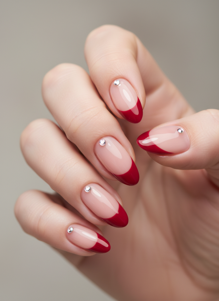 A single row of tiny crystal rhinestones follows the curve of the red tip line, adding sparkle and sophistication. The rhinestones catch light beautifully and give this mani a bridal or black-tie energy.