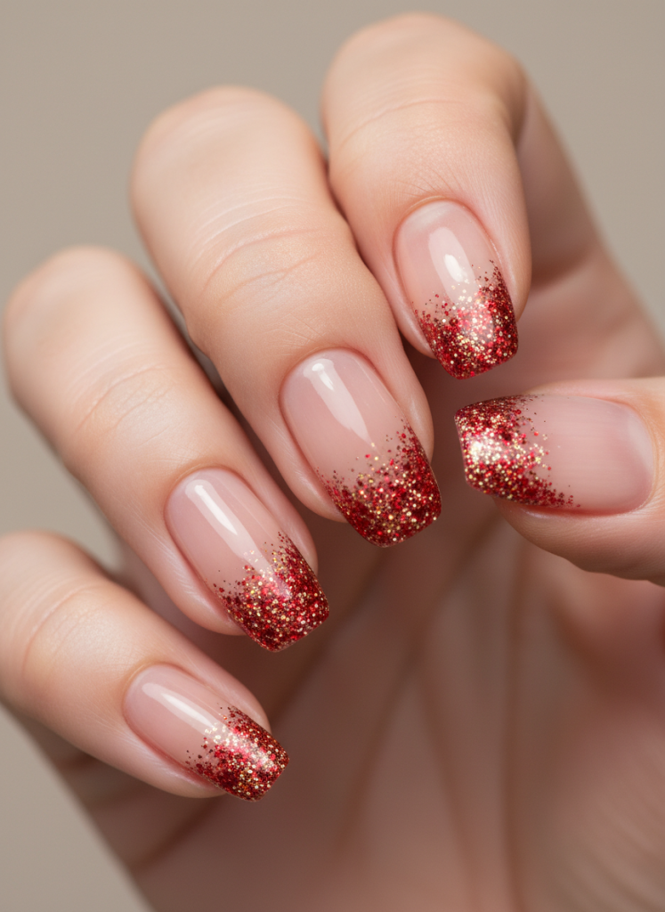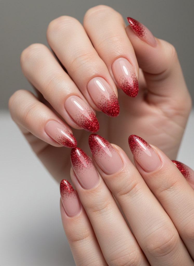 Sparkling red glitter fades from the tip toward the center of the nail, creating a gorgeous gradient effect. The glitter catches light from every angle and gives this mani a festive, party-ready feel.