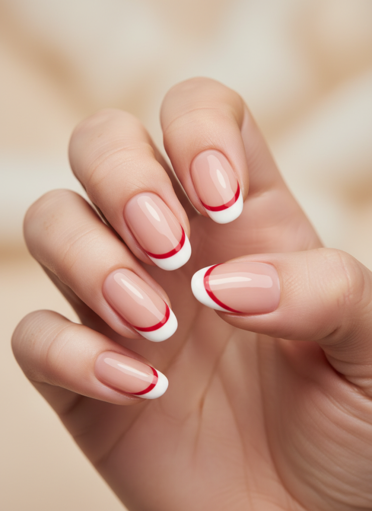 A thin white line sits just above a bold red tip, creating a layered double French tip effect. The two-tone combination adds dimension and a retro-modern feel that stands out immediately.