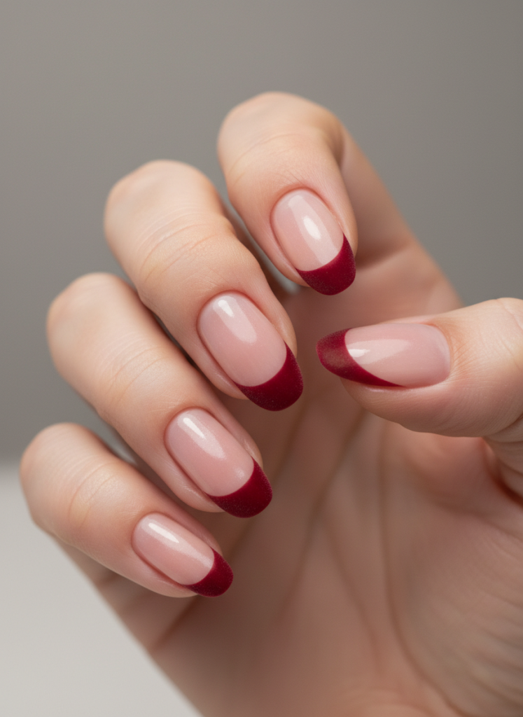 The red tips are finished with a velvety matte texture that looks and feels like crushed velvet against a glossy nude base. The contrast between the matte tip and shiny base creates a stunning tactile and visual effect.