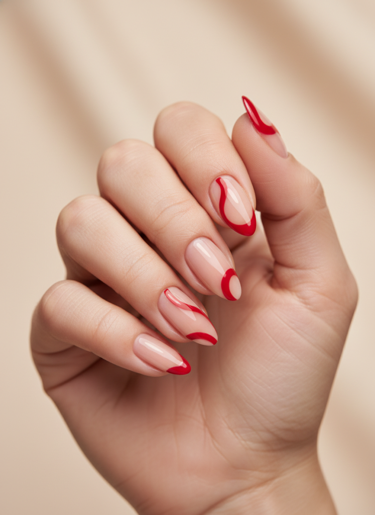 Bold red swooshes and abstract brush strokes replace the traditional straight tip line. Each nail features a different swoosh pattern, giving the set an artistic, hand-painted gallery feel.